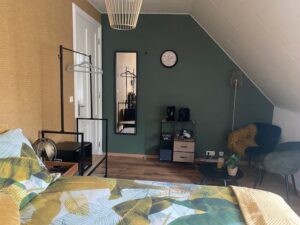 De kamer beschikt over een Lits-jumeaux boxspring (1x 160cm/ 2x 80cm), TV, zitje met twee stoelen, kledingrek, schrijfwaren, kluisje, koffiezetapparaat, waterkoker, koffie en thee (gratis), kopjes, glazen, koelkast gevuld met frisdranken en wijn (tegen betaling).